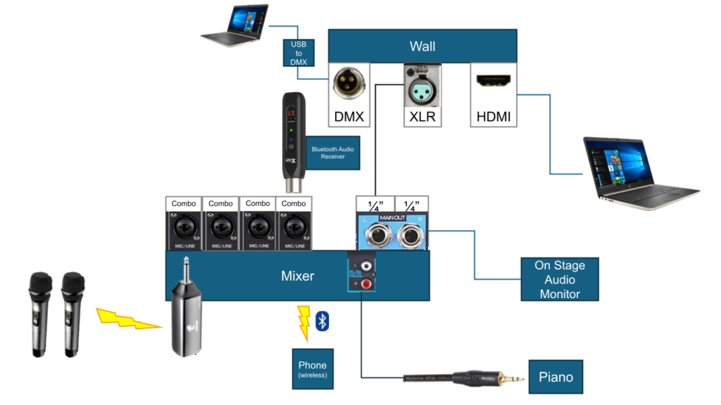 The primary requirement for our talent show was an audio amplification system. This consisted of: three wireless microphones, a digital piano, a phone to play music, a mixer, a monitor, amplifiers, and speakers.